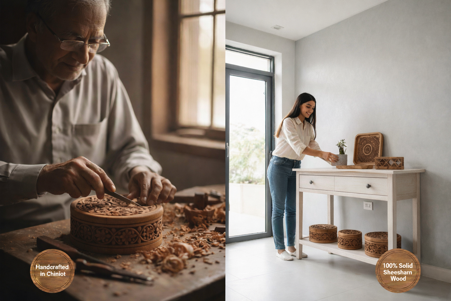 Each item at Shajarr is hand-crafted by expert artisans from Chiniot — Pakistan’s home of fine woodwork. Every carving and joint reflects years of skill, precision, and passion for authentic artistry.