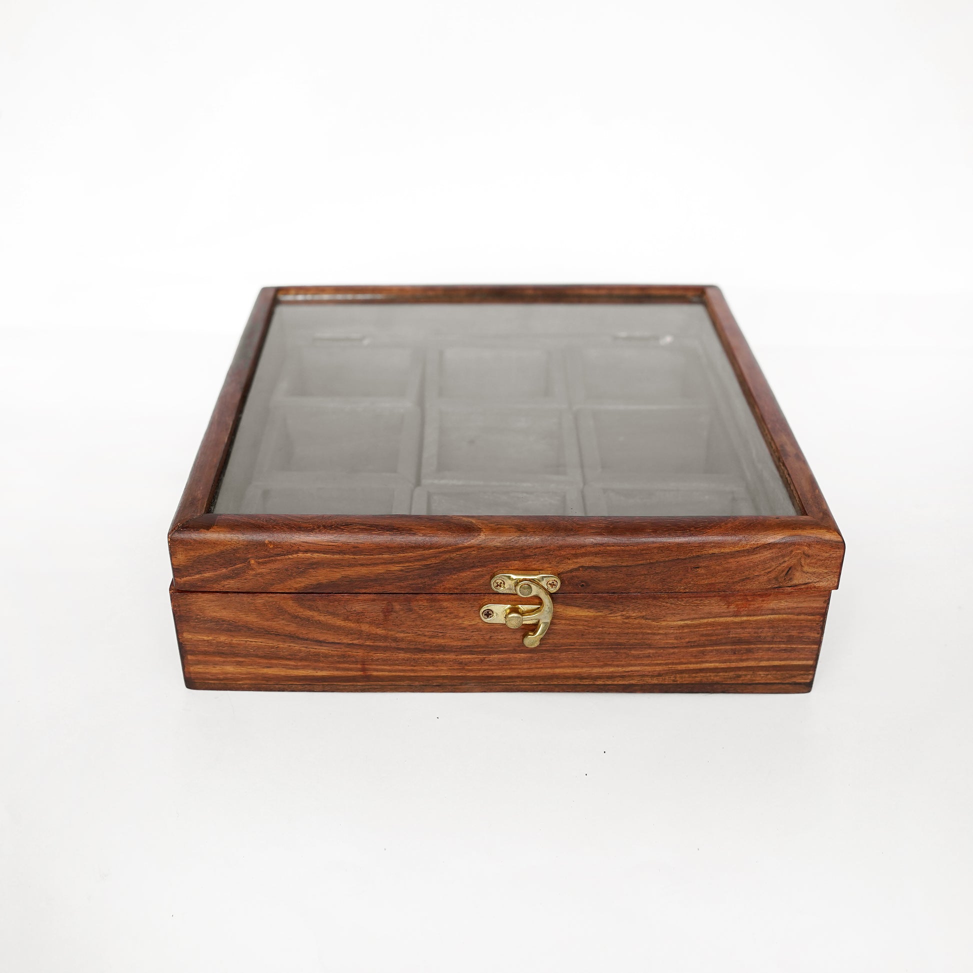 Organize your kitchen beautifully with this handcrafted wooden masala box made from rich, premium rosewood. Designed with nine spacious compartments, this spice organizer keeps your essentials fresh, accessible and perfectly arranged. Its polished grain, smooth finish and classic handcrafted detailing make it as elegant as it is functional.
